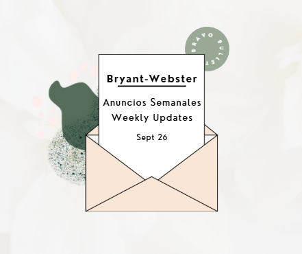 Bryant Webster necesita su ayuda para conocer mejor las fortalezas y las necesidades socioemocionales de nuestros estudiantes. Este año les pedimos a las familias que completen el cuestionario BESS (Sistema de Evaluación del Comportamiento y lo Emocional) para cada uno de sus hijos. Los resultados ayudan a nuestro equipo de salud mental a ofrecer intervenciones a todos los estudiantes que las necesiten. El cuestionario toma hasta 5 minutos por estudiante y se puede completar desde cualquier teléfono, tableta o computadora con acceso a internet.