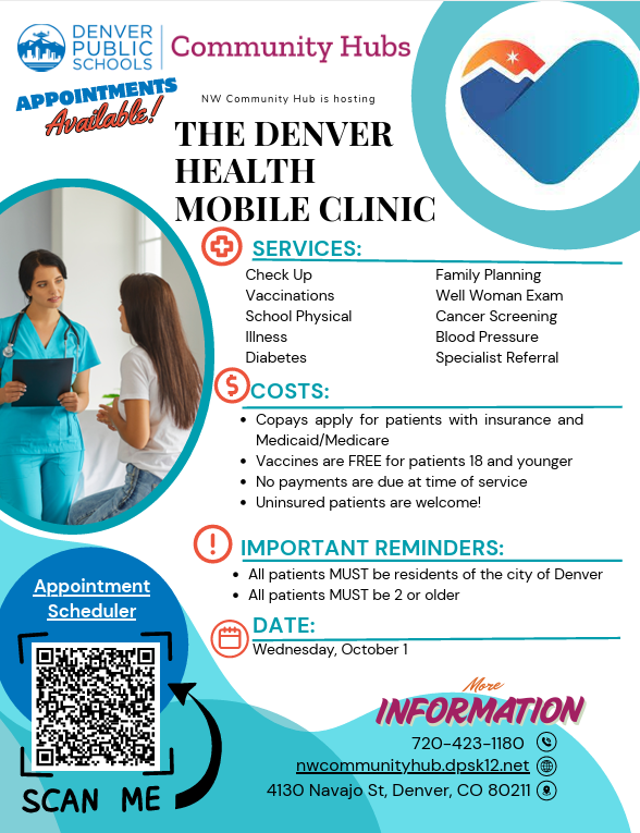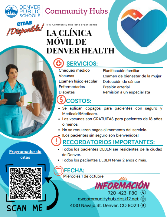Actualizaciones de Medicaid: ¿Sabía que nuestra escuela cuenta con un coordinador de extensión de Medicaid dedicado que puede ayudar a las familias en este proceso? Comuníquese con nuestra enfermería o con Zulma Oronia al 720-219-0238.