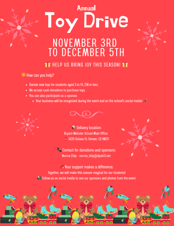 ¡Estamos recolectando juguetes nuevos y sin envolver para que nuestros alumnos de Bryant-Webster los reciban durante Las Posadas del 3 de noviembre al 5 de diciembre!