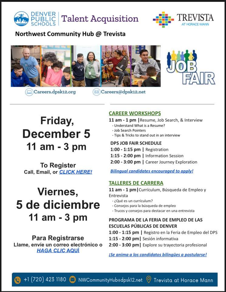 Join us on Friday, Dec. 5 from 11 a.m.-3 p.m. for a comprehensive Career Job Fair and Workshop at the Northwest Community Hub at Trevista Academy.