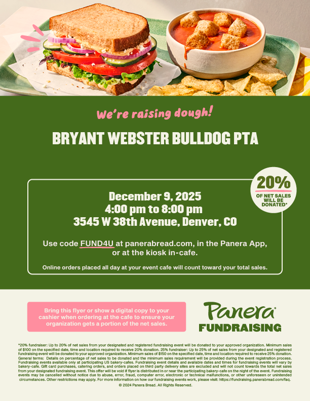 20% of sales will be donated to the Bryant Webster PTA to support our school and community engagement programs.