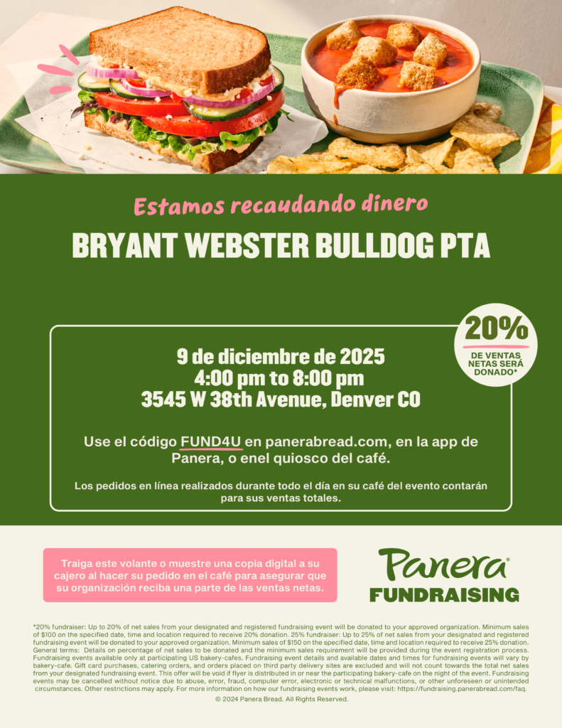 El 20% de las ventas se donará a la PTA de Bryant Webster para apoyar nuestros programas de participación escolar y comunitaria.